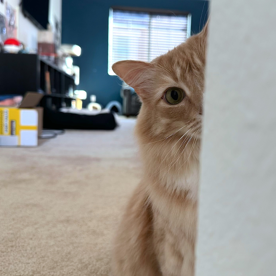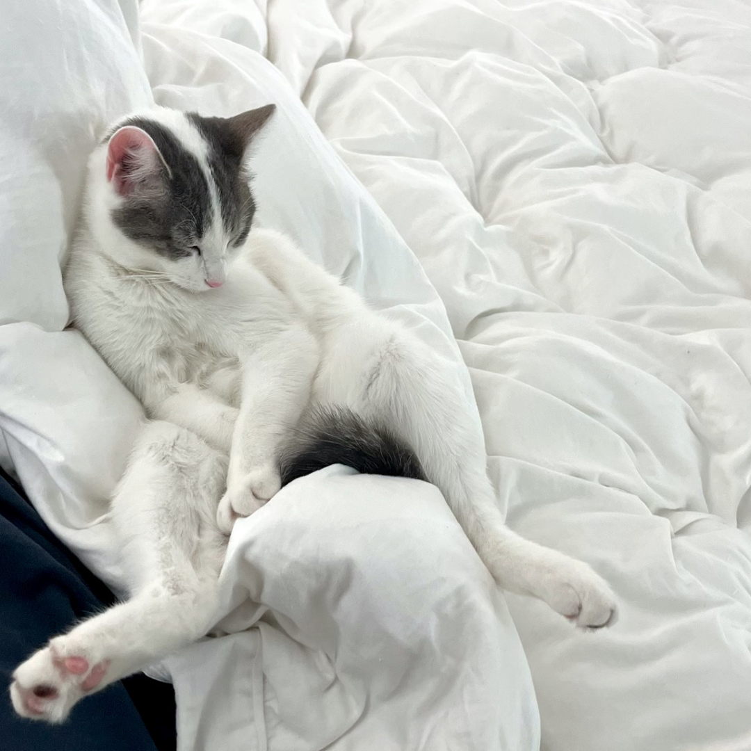 This is Nova (3). She’s an old soul in a small cat body. She makes the cutest trilling noises all day and follows Remi wherever he goes. She’s super loving and sweet. She makes everyone laugh because of her silly behavior, she’s probably the most well adjusted animal in the house. She loves to eat and lets everyone know when she’s hungry.