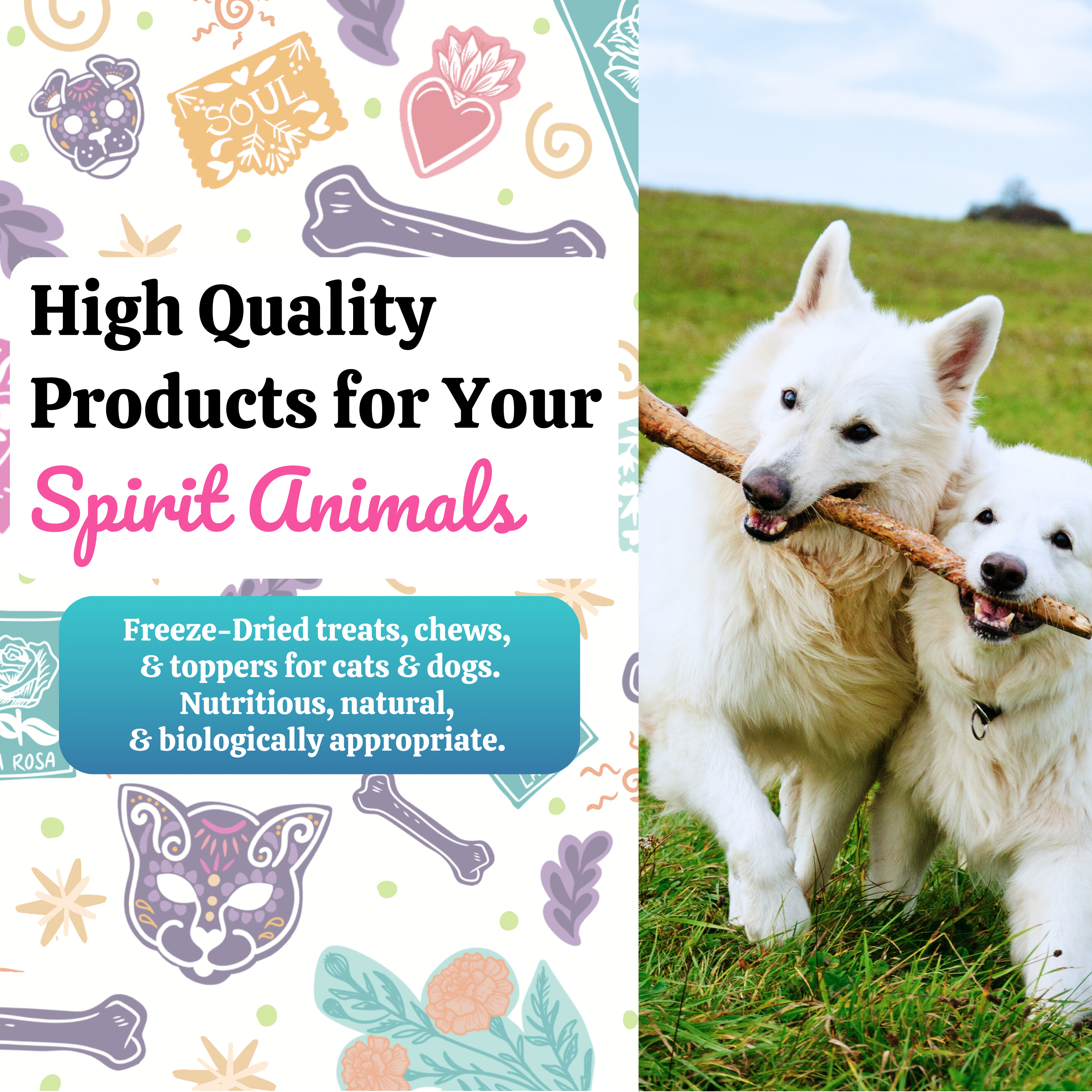 Our freeze-dried products are created for us by Glacial Freeze Dry LLC., a Safe Quality Food (SQF) certified manufacturing facility, a globally recognized food safety and quality certification system. It's a trusted standard for the food industry, and we are proud to provide that same standard for your spirit animals. Our freeze-drying process ensures top quality and maximum nutrient retention.